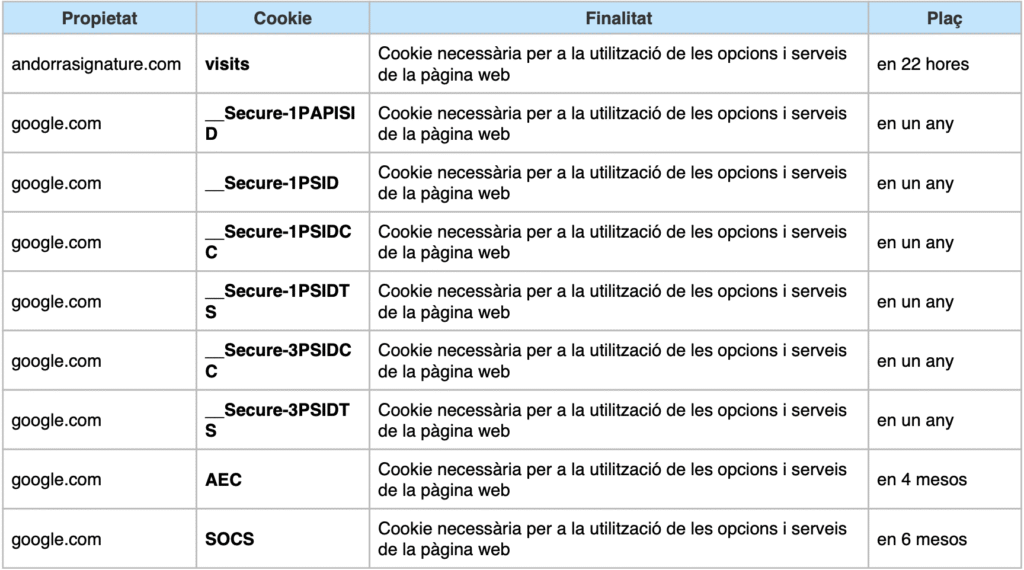 Segons la directiva de Andorra, les cookies que requereixen el consentiment informat per part de l’usuari són les cookies analítiques i les de publicitat i afiliació, i queden exceptuades les de caràcter tècnic i les necessàries per al funcionament del lloc web o la prestació de serveis expressament sol·licitats per l’usuari.