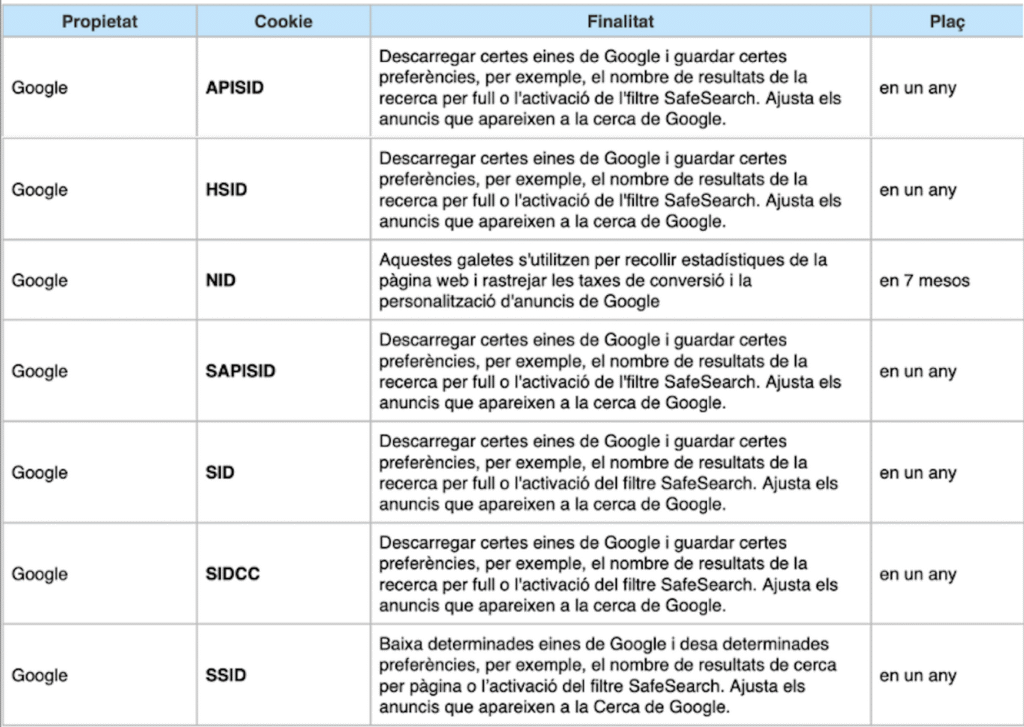 COOKIES UTILITZADES EN AQUEST LLOC WEB